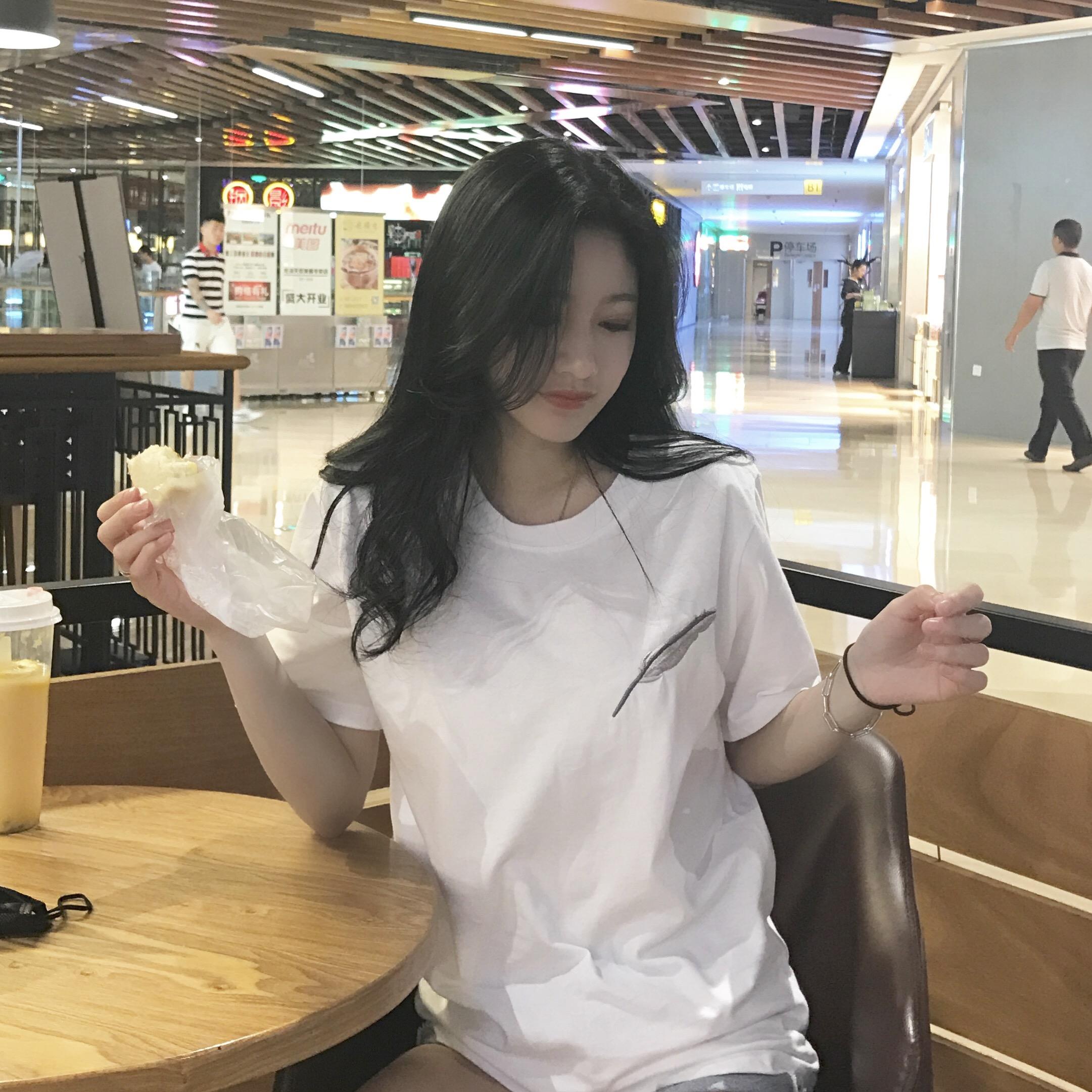 / 夏裝2018新款女羽毛刺繡百搭圓領顯瘦上衣氣質小寬松短袖套頭T恤