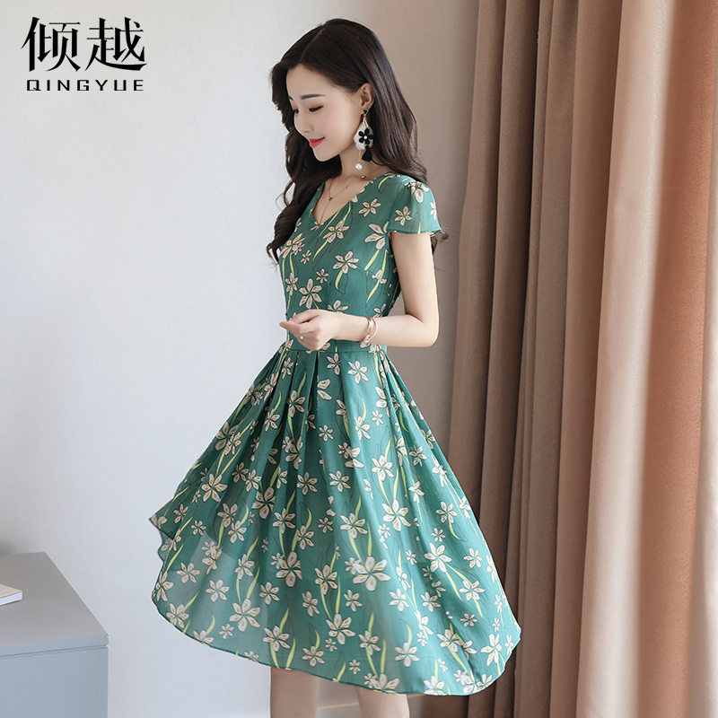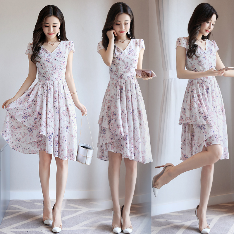 2017夏裝新款短袖收腰顯瘦氣質淑女v領碎花高腰雪紡連衣裙女夏潮