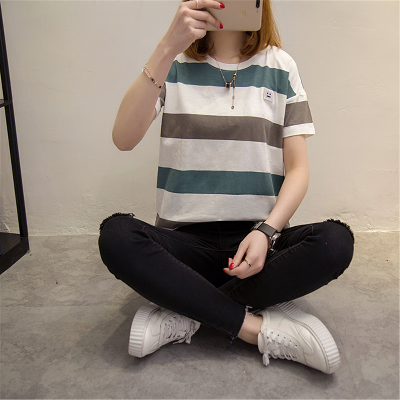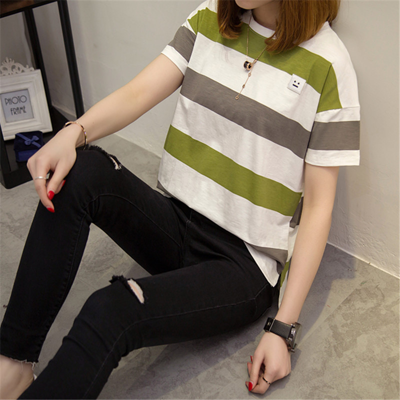 / 女裝春裝新款女裝短袖t恤女條紋卡通學生韓版寬松顯瘦打底衫