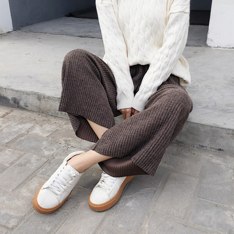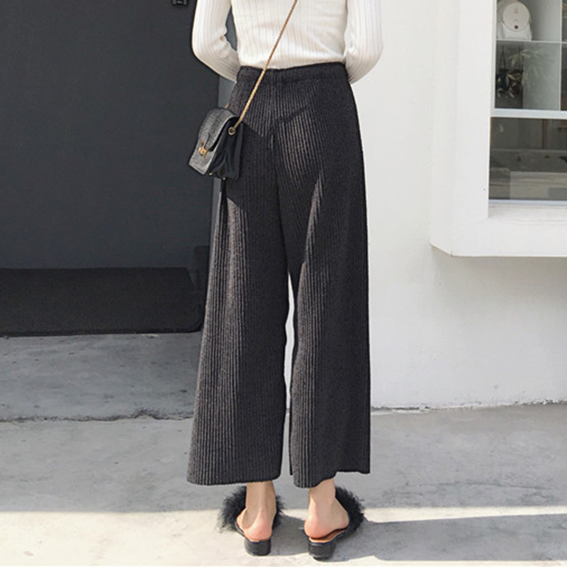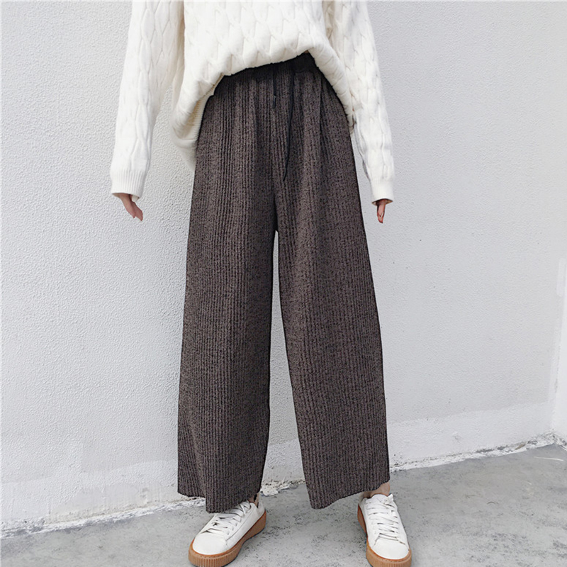 / 復古風坑條高腰顯瘦九分褲秋裝女2018新款純色寬松闊腿褲休閑褲子
