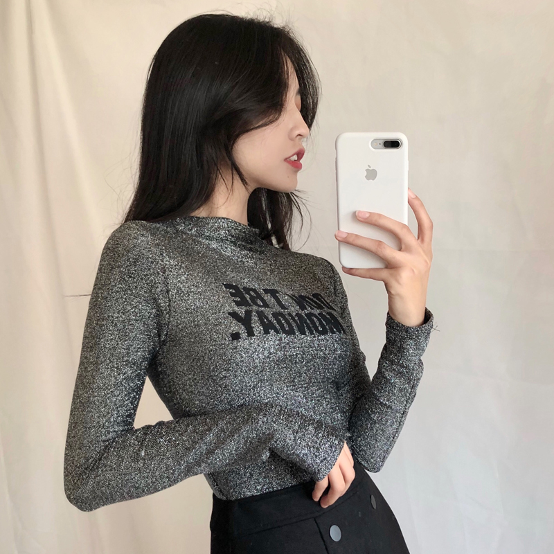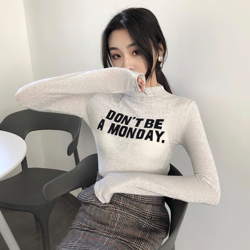 2018顯瘦新款秋季百搭韓版女字母印花半高領長袖打底衫T恤上衣潮