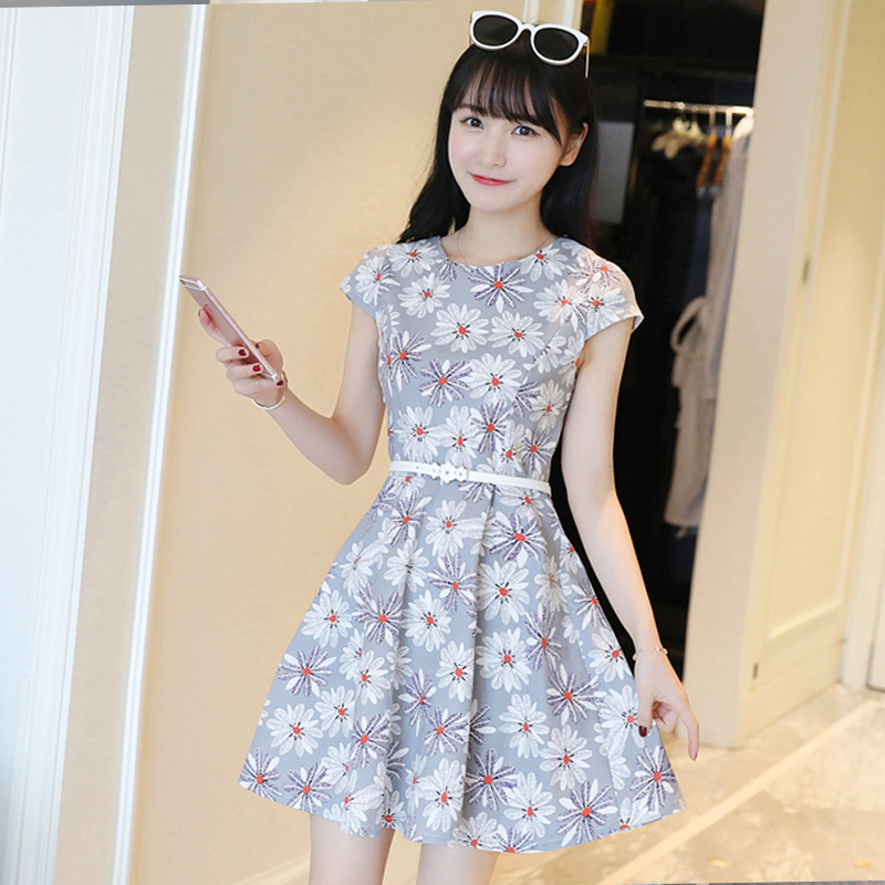 夏季新款韓版女小清新修身顯瘦印花a字裙時尚連衣裙女裝中裙