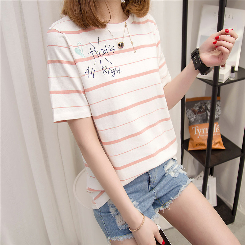 / 條紋短袖t恤女寬松顯瘦上衣打底衫女學生百搭春季時尚新款潮