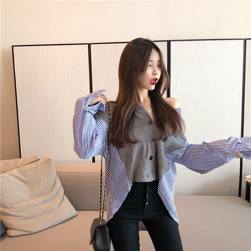 / 韓國慵懶風條紋拼接襯衣女2018新款秋冬針織開衫外套女假兩件上衣