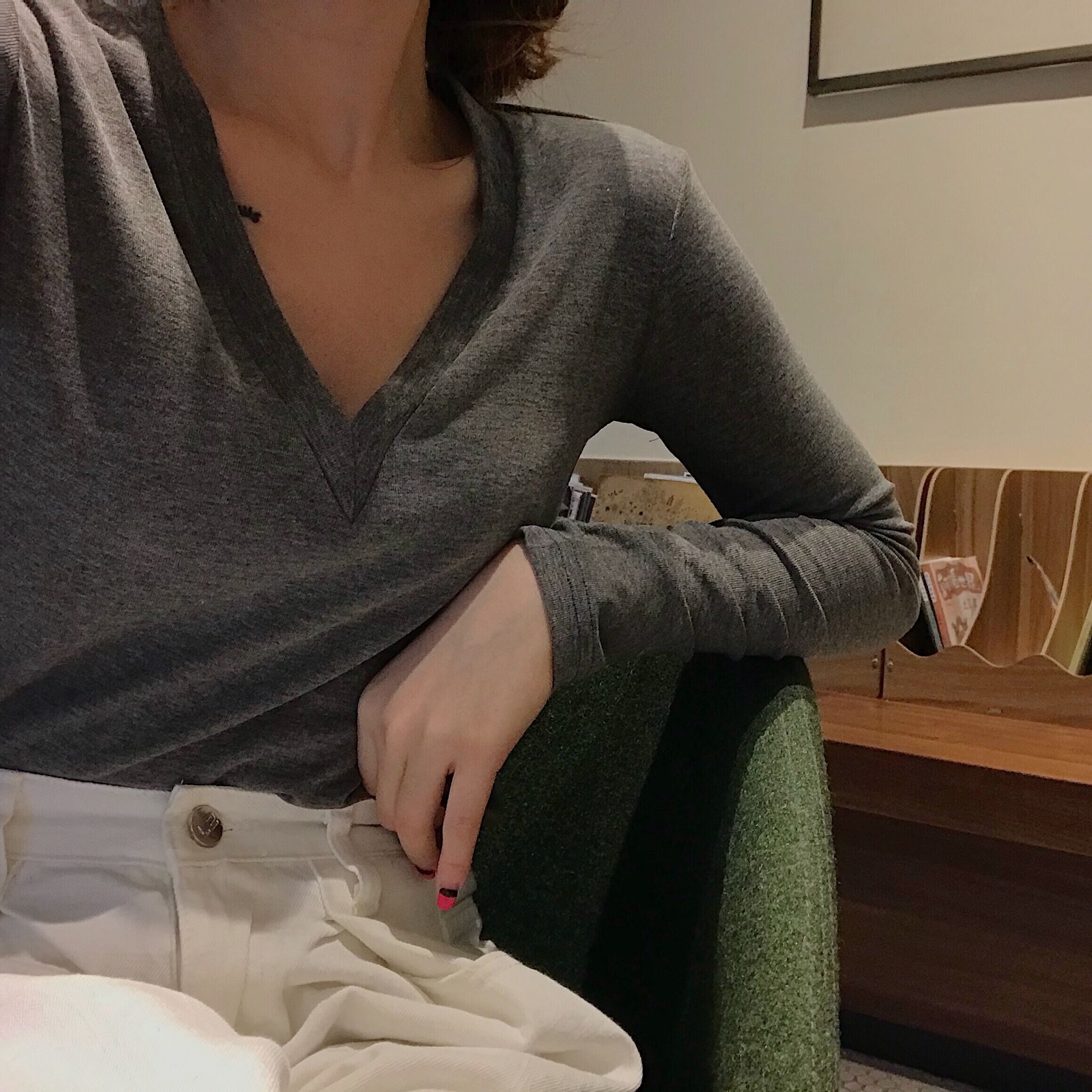 / 韓風早秋純色V領長袖修身chic上衣女T恤顯瘦簡約基礎百搭打底衫