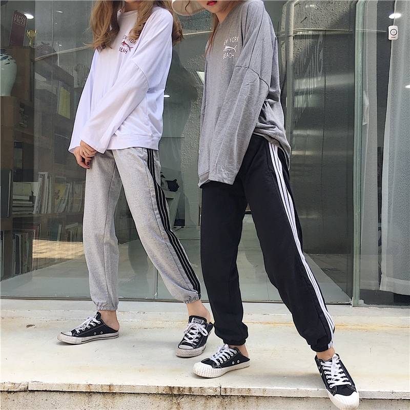 / 春裝新款女裝日系三道杠男女情侶運動褲學生休閑衛褲束腳哈倫褲潮