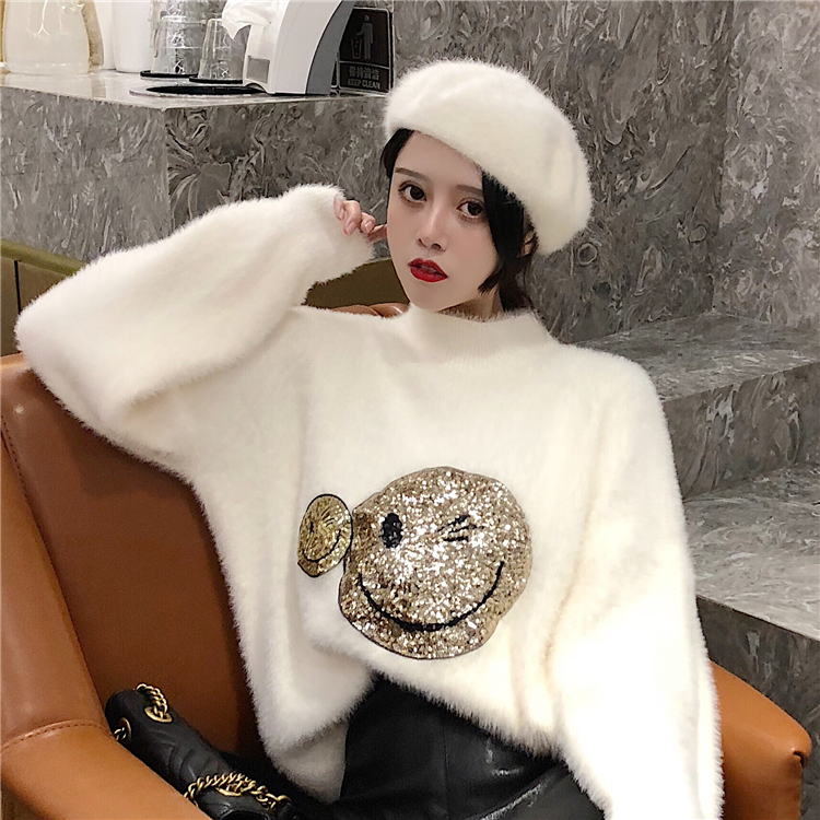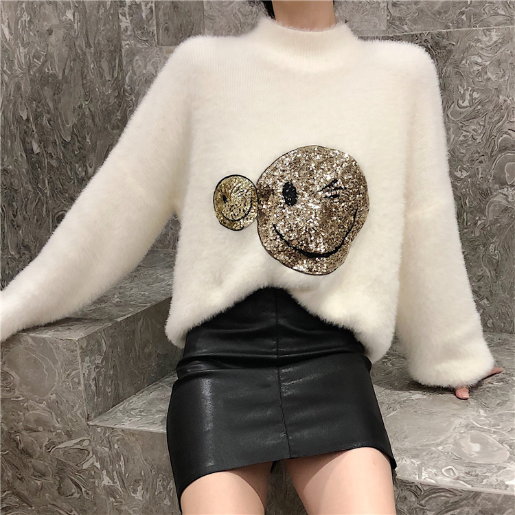 2018早秋針織衫女寬松慵懶黑色軟糯毛衣女毛絨絨圓領套頭笑臉上衣