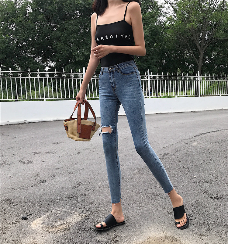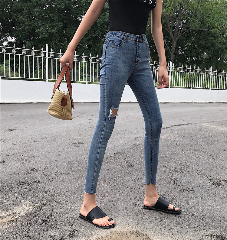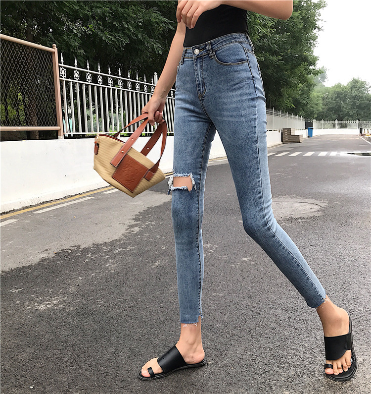 / 褲子2018秋季新款高腰緊身彈力破洞牛仔褲潮小腳破邊九分鉛筆褲女