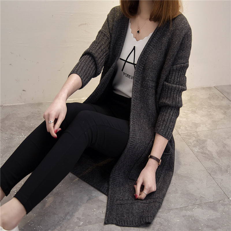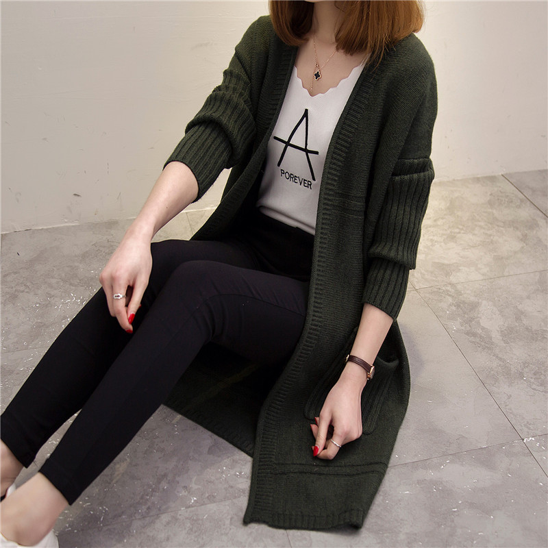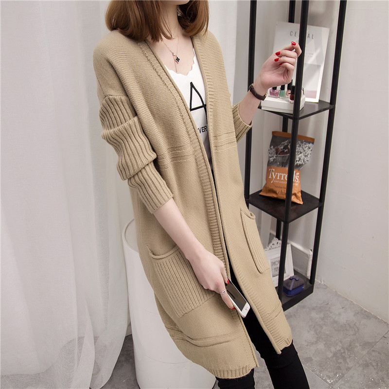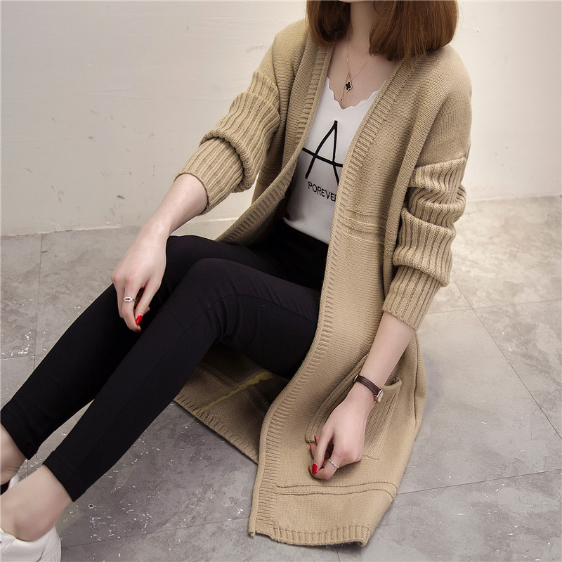 / 中長款春秋季新款女裝韓版針織衫開衫寬松百搭毛衣外套口袋潮